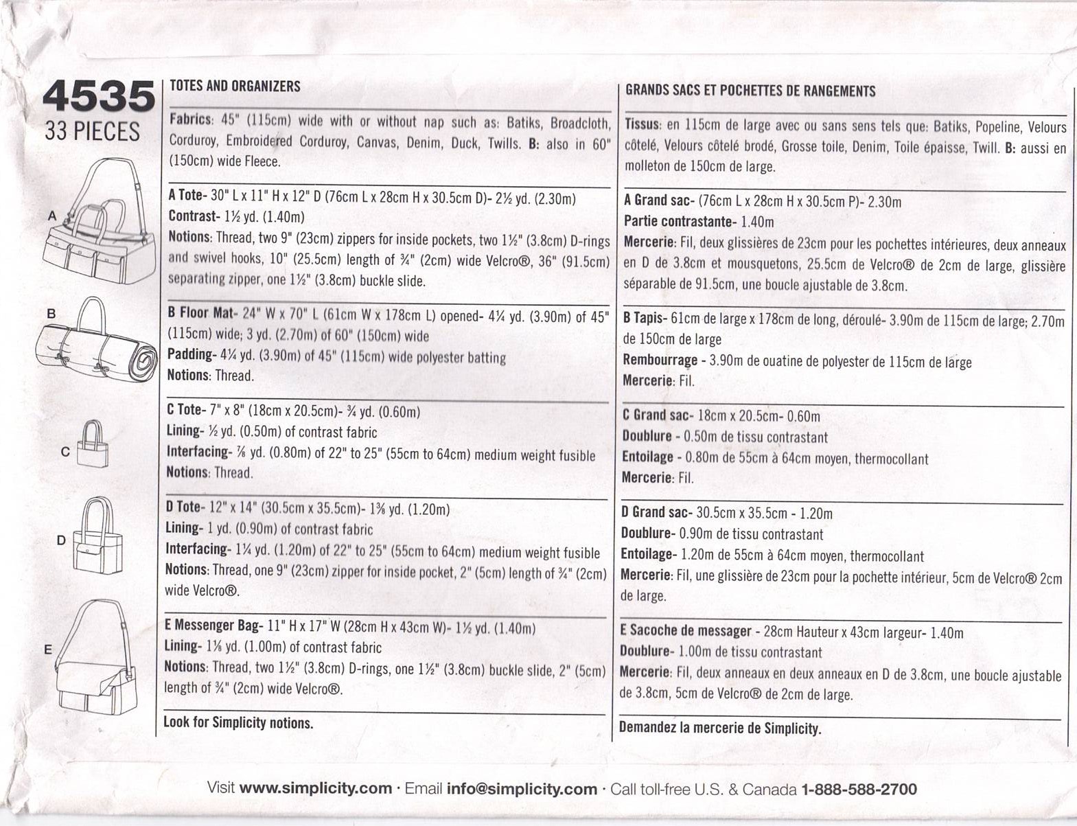 Simplicity Sewing Pattern 4535 Tote Messenger Bags Organizers Floor Mat Ebay