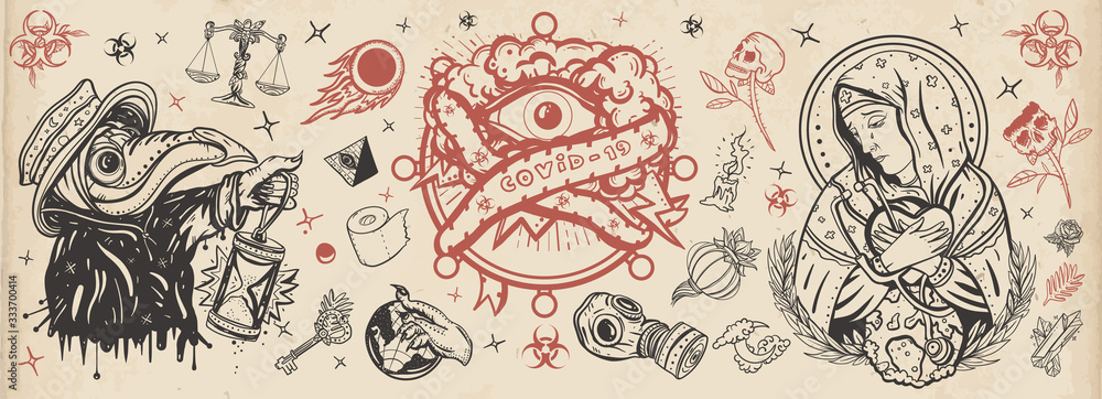 Coronavirus Old School Tattoo Stop Epidemic Virgin Mary Mourns The Death Of World All Seeing Eye Plague Doctor Covid 19 Sars Cov 2 Traditional Tattooing Medieval Style Stock Vector Adobe Stock